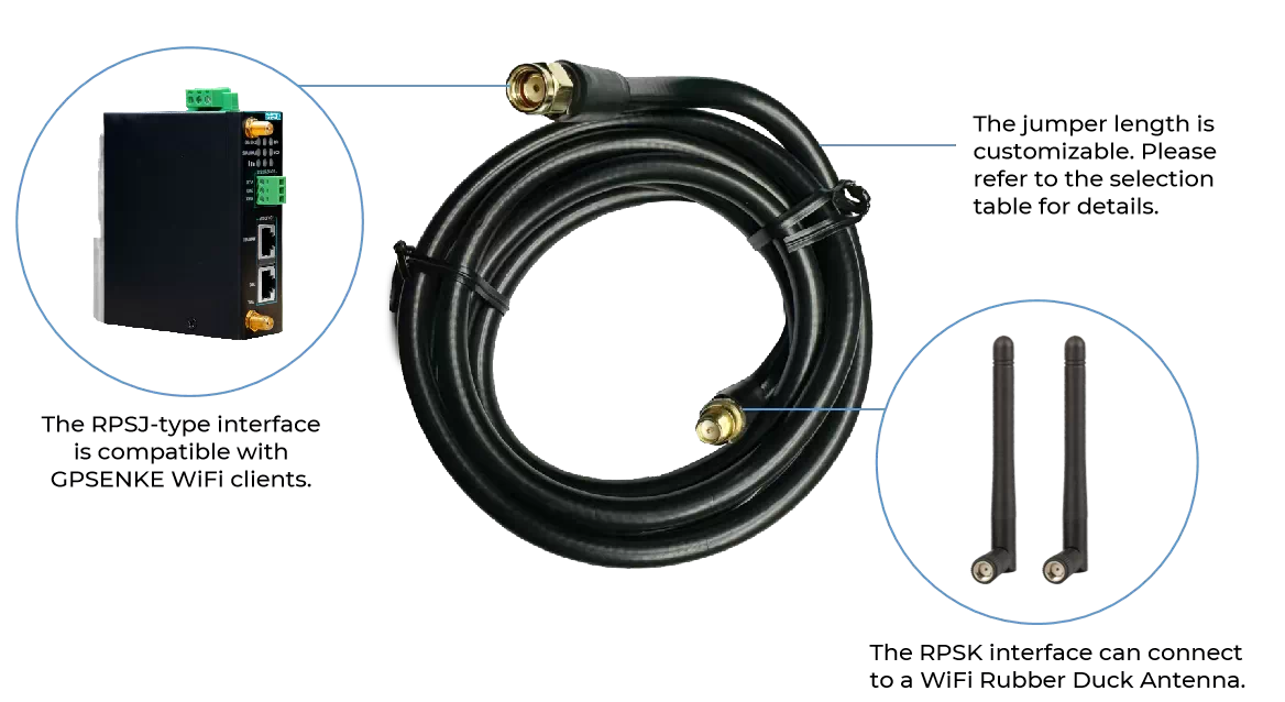 The GP-FC200-RPSJ-RPSK-5 Series is a low-loss feeder extension cable from GPSENKE, it is build for harsh industrial environments. Featuring RPSJ to RPSK connectors, it ensures ultra-low signal loss and latency with foamed polyethylene insulation.